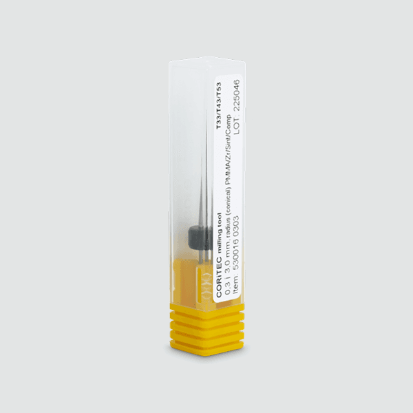 Фреза T33/T43/T53 — оригинальная сферическая твердосплавная фреза конической формы (radius milling tool, conical) для фрезеровки заготовок из циркона (ZrO2), пластмассы (PMMA), воска (WAX), спечённых металлов (Sinter Metal) и композитов (COMP). Применяется для чистовой обработки и достижения максимальной детализации анатомии — фиссур, межзубных промежутков и тонких участков конструкций. Характеристики фрезы: Тип инструмента: radius milling tool (conical) Диаметр рабочей части (d1): 0.3 мм Диаметр хвостовика (d2): 3.0 мм Форма: коническая, сферическая (conical radius) Материал: твердосплав (Carbide) Назначение: PMMA / WAX / ZrO2 / Sinter Metal / Composite Совместимость: CORiTEC one / one+, 150i, 250i Loader, 450 (цанга 3 мм)
